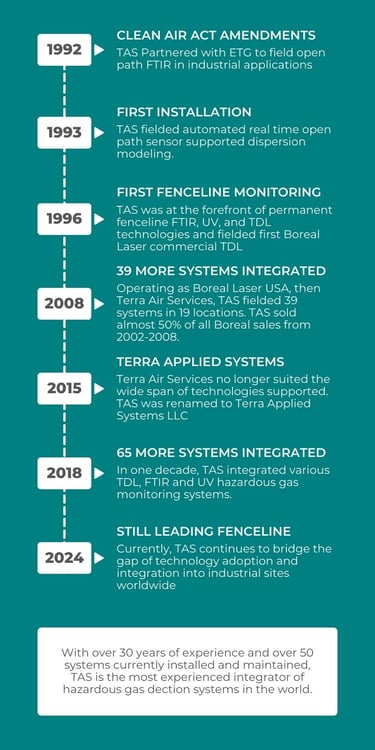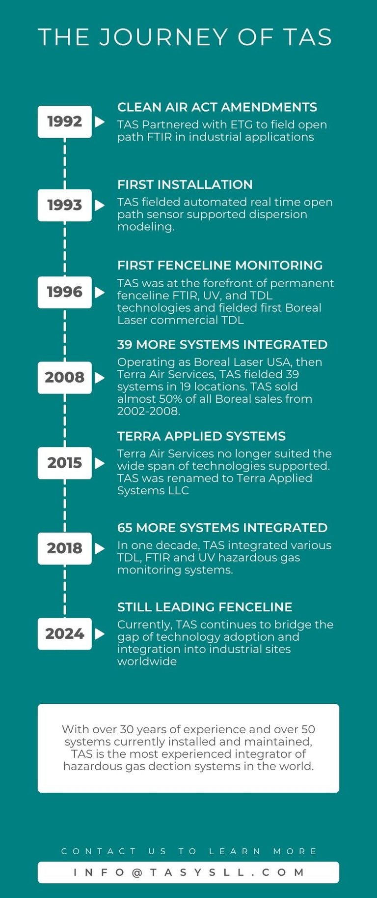 Terra Applied Systems LLC (TAS) arose from an initiative to address an anticipated market in remote sensing systems that resulted from the 1992 Clean Air Act legislation. It began as a spin-off from Terra Laboratories, Ltd. in League City, Texas, an independent testing laboratory serving industrial and commercial customers reliable environmental and industrial chemical testing.